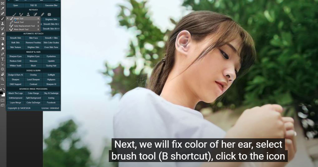 (4). Next, we will fix color of her ear, select brush tool (B shortcut), click to the icon below black and white color. It's “edit in quick mask mode” (Q shortcut). After you are choosing that mode, the layer filled with red, then just paint over her ear and click again to the quick mask to turn it off. Now, her ear is selected.