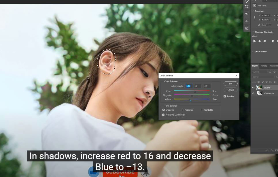 (5). Open color balance by pressing CTRL or CMD + B, in color balance window, there are 3 tone balance: Shadows, Midtones and Highlights. In Midtones, let’s increase red to 9, decrease blue to –4. In shadows, increase red to 16 and decrease Blue to –13. Last thing, Highlights, red to 7, green to 1 and blue to –4. the color in her ear is now balance, it’s the same tone with her skin.