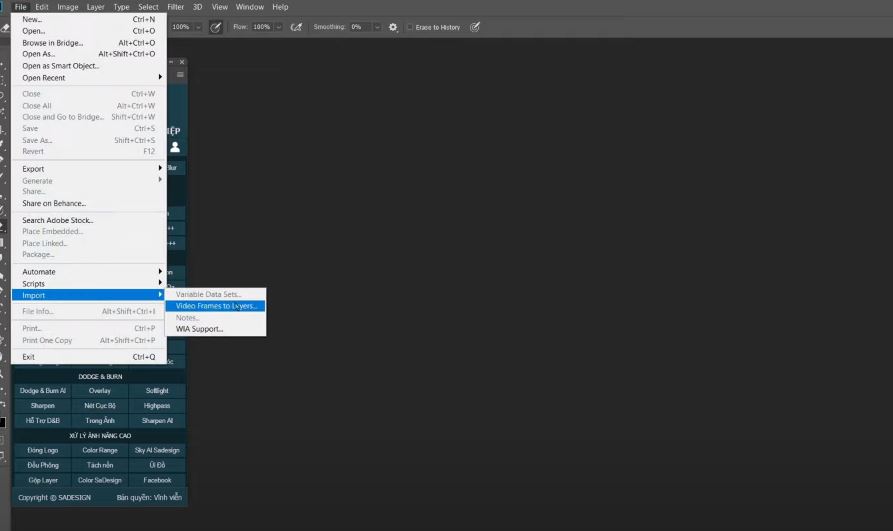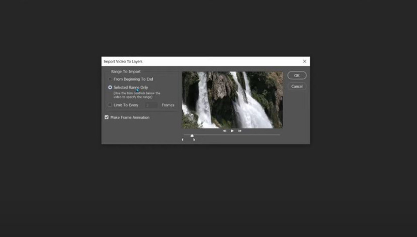 Let’s import it into Photoshop, go to File > Import > Video Frames to Layers > Open the video. In this window, you can take the whole video in the first option or you can select the range of it.