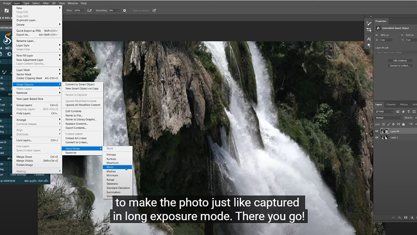 Head to Layer > Smart Objects > Stack Mode > Mean > this helps to make the photo just like captured in long exposure mode. There you go!