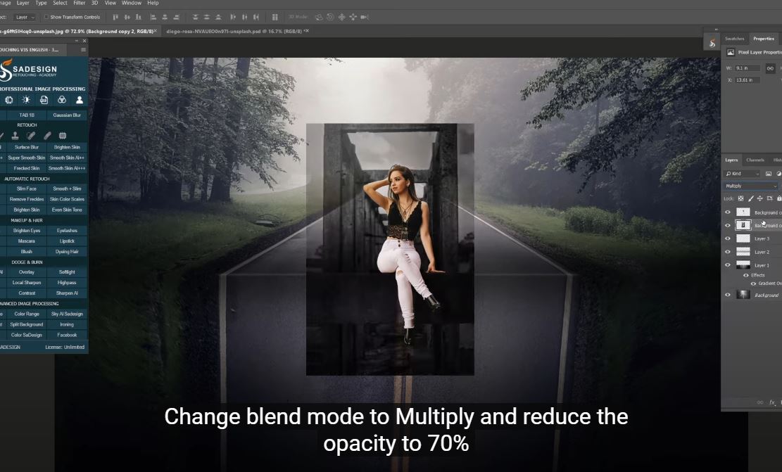 Next, we will add the shadow to the subject, remember the background that we brought together with the subject? It’s in the second layer, press CTRL+SHIFT+U for Win or CMD+ SHIFT+U for MAC to remove colors. Change blend mode to Multiply and reduce the opacity to 70%