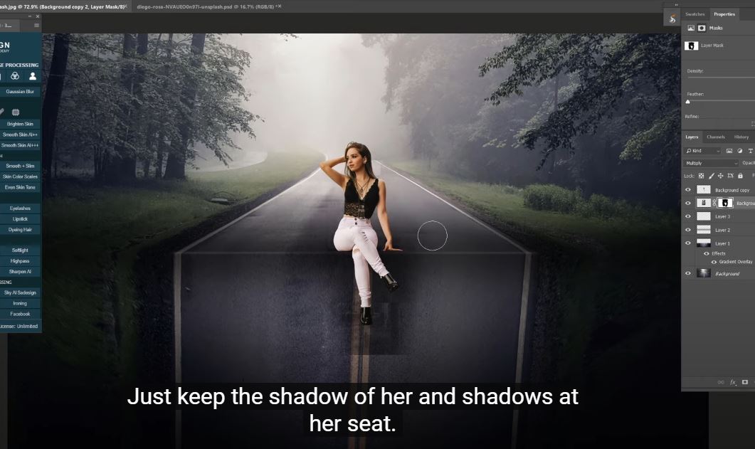 Adjust the opacity if needed. Back to subject layer, use Burn tool, to add a little bit of shadow to the subject, on her legs, thighs so it will look realistic.