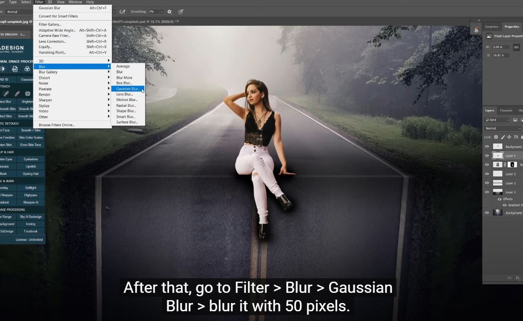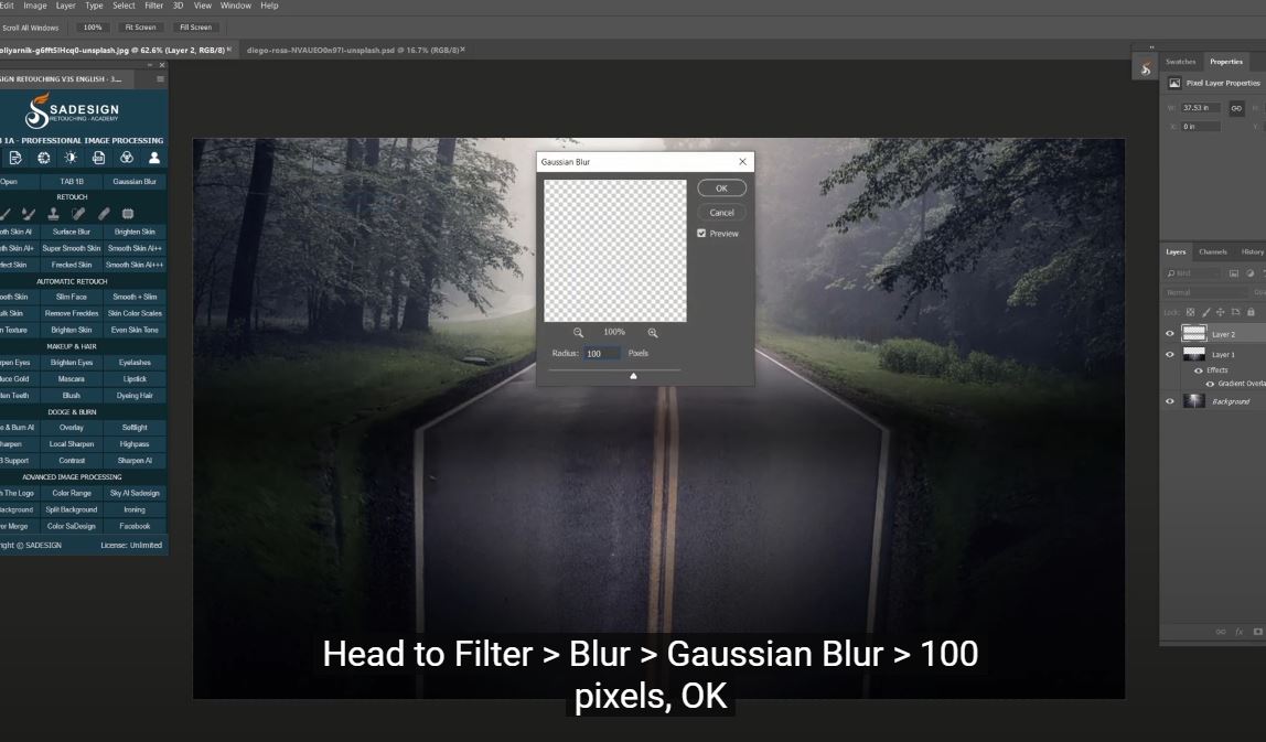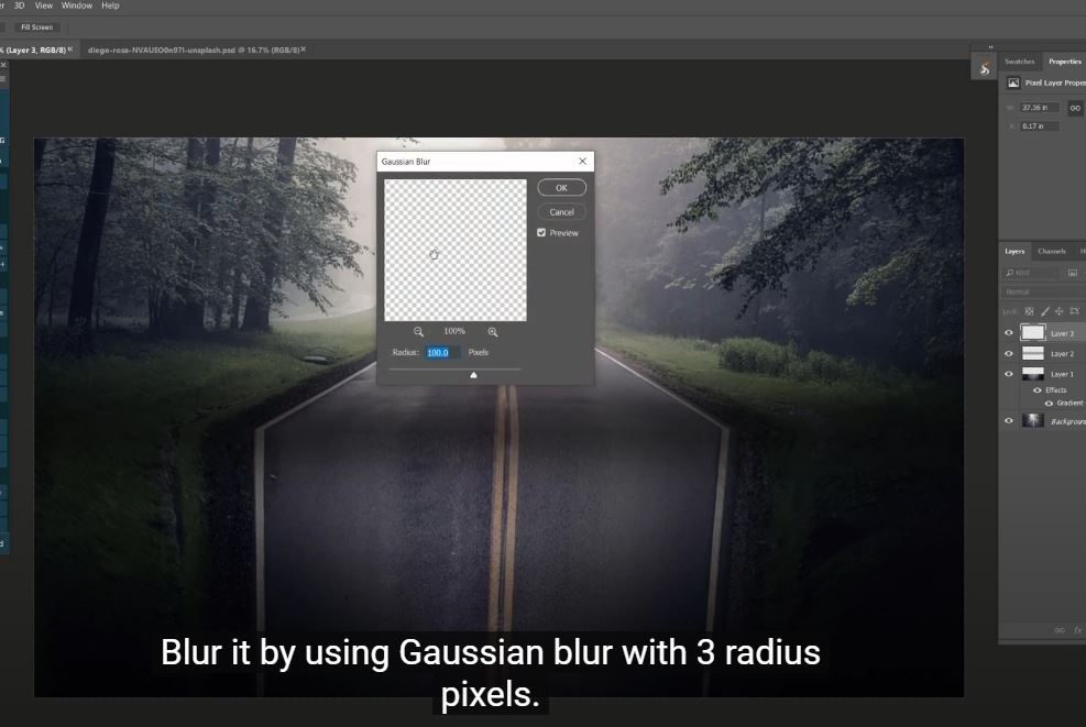 Create a new layer, Use Rectangular tool to make the selection at the corner of the cube. Fill the selection in black with shortcut ALT or OPTION + Delete. Before that, make sure foreground color is black. Head to Filter > Blur > Gaussian Blur > 100 pixels, OK Create another new layer, this time we will draw a super thin line at the edge of the road.
