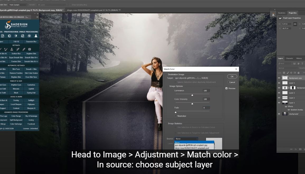 Now, I will match the color of the subject and the background of the road. Head to Image > Adjustment > Match color > In source: choose subject layer In layer: choose the background Make sure to check “Neutralize” box Increase Fade to the point that you see the color really matching to each other.