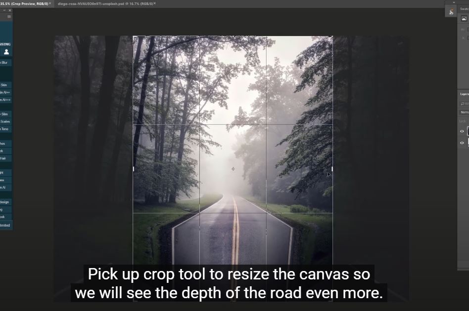 Pick up crop tool to resize the canvas so we will see the depth of the road even more.