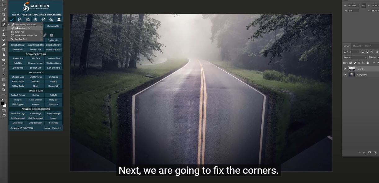 Next, we are going to fix the corners. Zoom closure, simply use “Spot healing brush tool” in this case to brush on the corner and let Photoshop fix it.