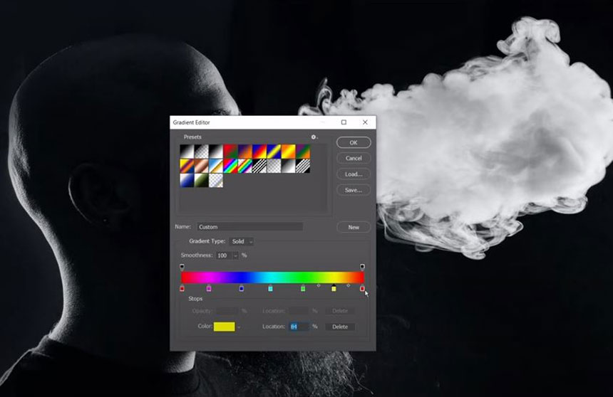 Make sure you choose “linear gradient” icon, opacity 100% and foreground is black color and background color is white.Make sure you choose “linear gradient” icon, opacity 100% and foreground is black color and background color is white. Now, draw the line from his mouth to the smoke direction to create gradient effect. Change its blend mode to Color. You can see the smoke blended with lots of colors. We just want to keep the color in the smoke so for the rest, we will remove colors on those areas.