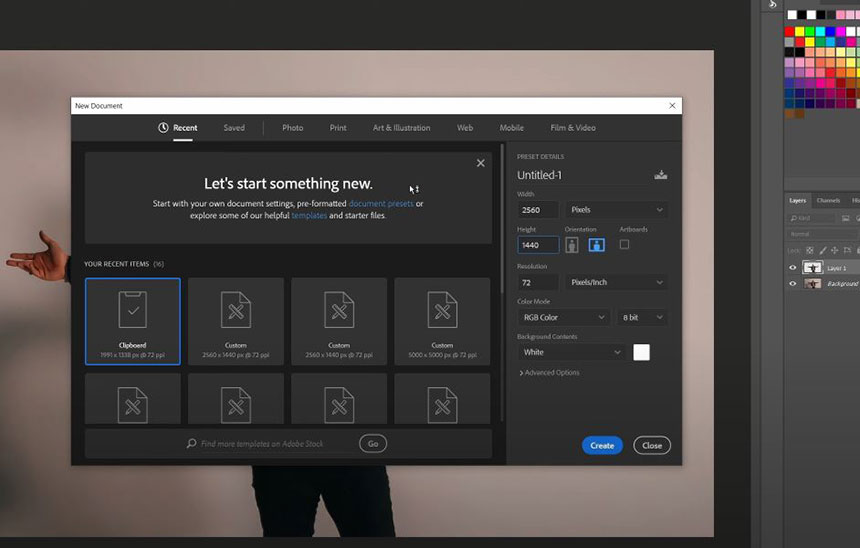 Press CTRL + N to create a new document. Width 2560 pixels Height 1440 pixels Resolution 72 Background contents: use this color code #2e2e2e