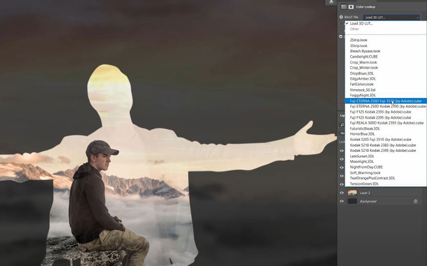 Create a color lookup adjustment to add color preset to the photo. Select Fuji Eterna in 3DLUT file