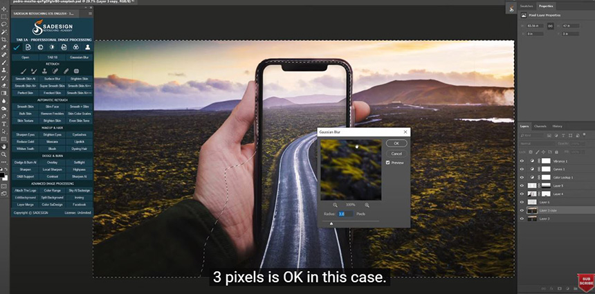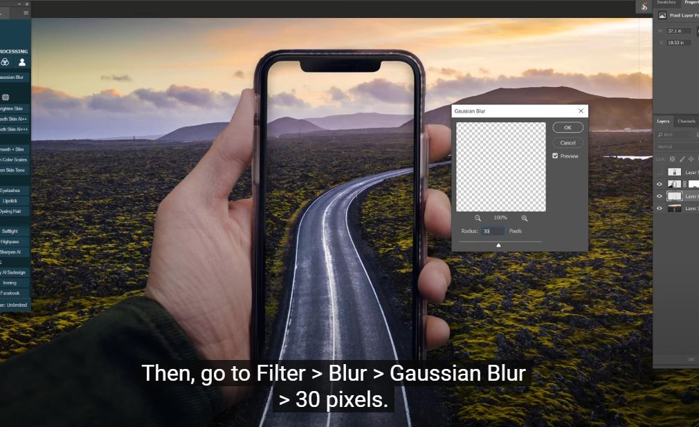 Then, go to Filter > Blur > Gaussian Blur > 30 pixels. OK Take the selection of the screen again by holding CTRL and click to top layer.