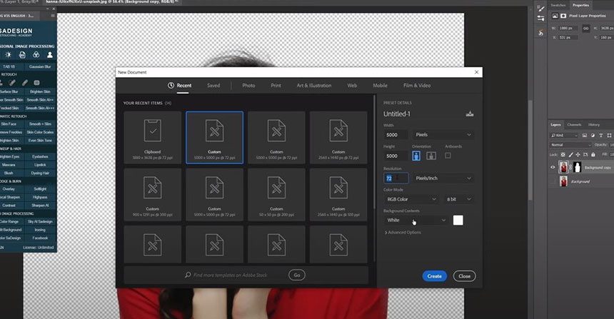 Press CTRL or CMD + C to copy this layer. Go to File > New > choose Custom and set the values as below Width 5000 Height 5000 Resolution 72 Color mode: RGB color