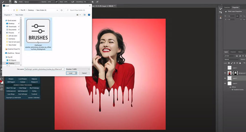 CTRL+T to expand and move it down. Hold CTRL key and click to layer 1 to take its selection. Turn off layer 1, select the mask of subject layer, then press Delete In Layer 0, create a new layer with this icon, pick up brush tool, click to arrow icon, drop down menu in wheel icon and select “Import Brushes”. Load this set of splatter brushes.