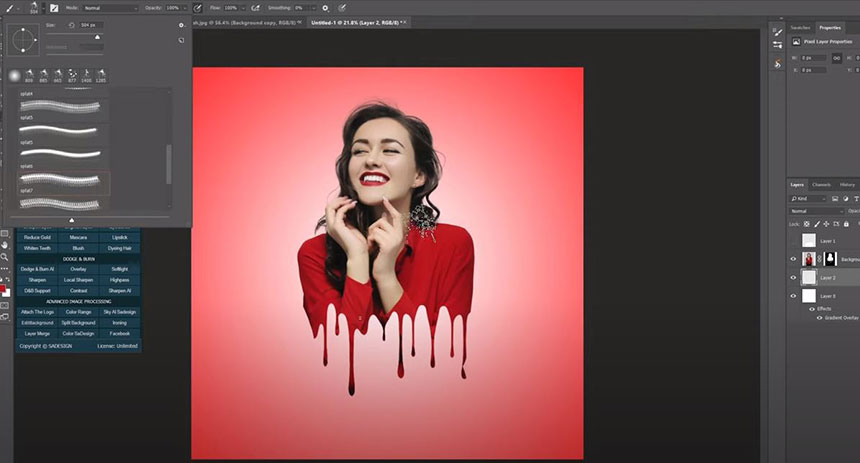 Open splatter folder, choose the brush that you like, increase brush size with this bracket ]. Set foreground color to dark red to match with the background and subject color. Dab to apply the brush to the image. Change to different brushes to create a unique dripping effect. Create a new layer for using other brushes.
