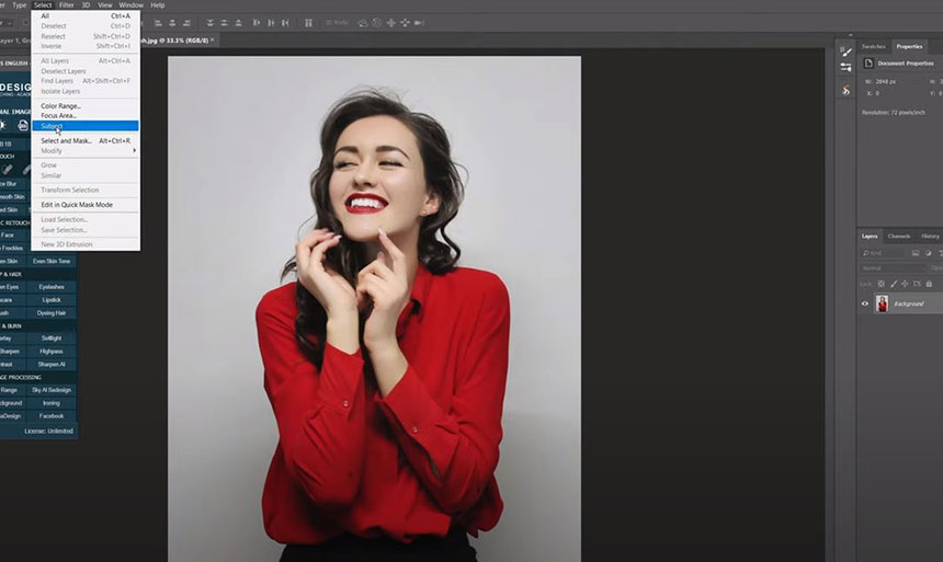 At first, we will separate the subject from the background. Go to Select > Subject, Photoshop AI will choose the subject for us. Head to Select > Select and Mask > use Refine Edges Brush tool to make its selection accurate. Paint over her hair and her body to remove the background left.
