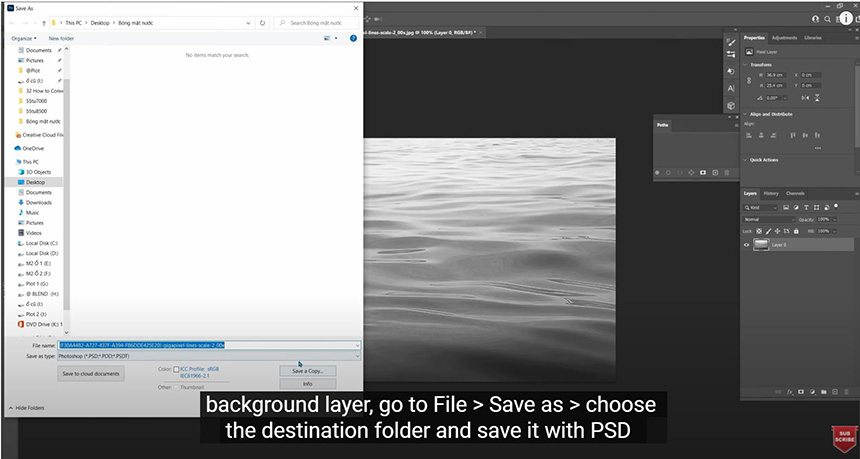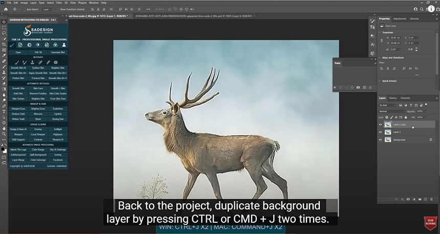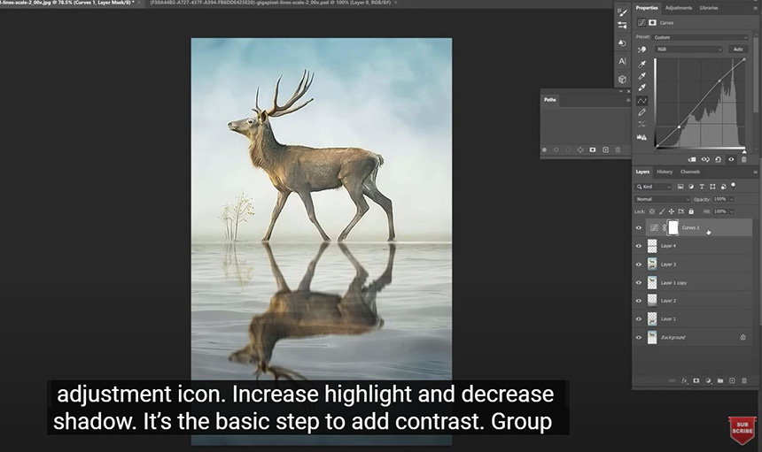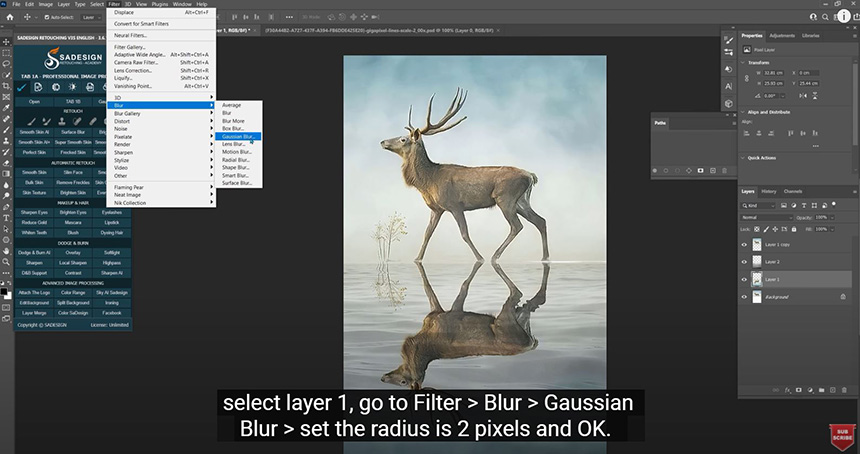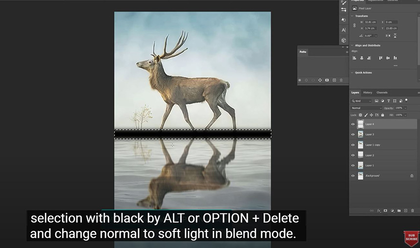 Select layer 1, flip it with CTRL or CMD + T, click to the top and drag all the way down to the bottom. Now, we just made the reflection of dear. Go to Filter > Distort > Displace > set horizontal scale and vertical scale at 10. Make sure to choose displacement map is “stretch to fit” and undefined areas is “repeat edge pixels”. OK > the window pops up, we will choose the PSD file that we’ve saved in the first step.
