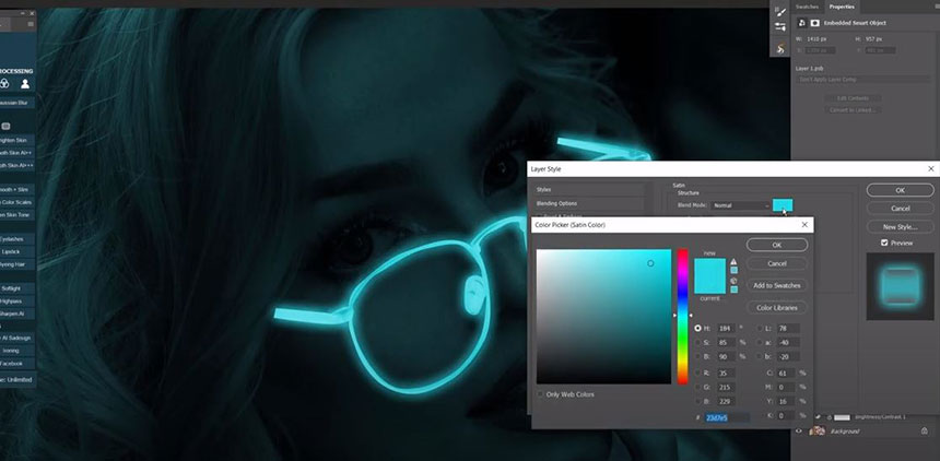 Hue 183 Saturation 66 Lightness 33 Click to fx icon, select “Blending Options”, add Outer Glow effect. Blend mode Linear Dodge Opacity 59% Color code #1ed7e5 Check to Satin effect, use the same color that we just used. Opacity 60% Angle 90 degrees Distance 50 pixels Size 80 pixels Check to “Inner Glow”, use the same color code as well.