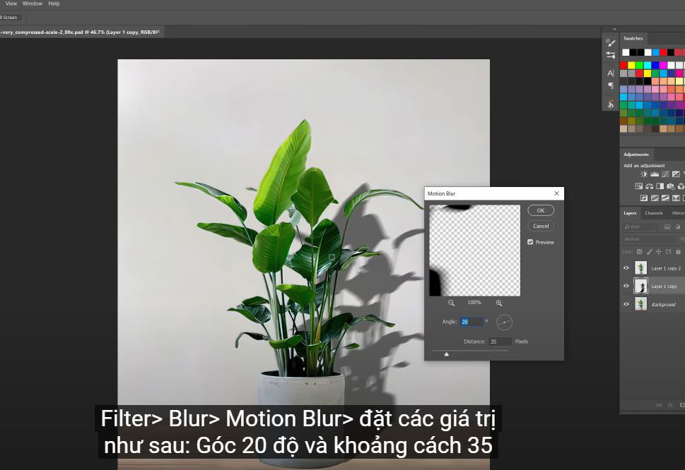 (7).Adjust the opacity to 55%, add motion blur to it. Filter > Blur > Motion Blur > set the values as follows: Angle of 20 degrees and a distance of 35 pixels.