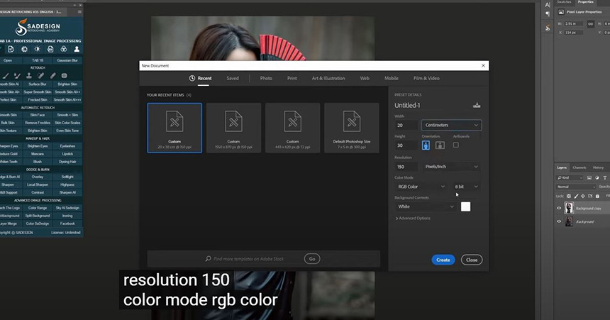 Now, press CTRL or CMD + N to create a new document. Following the values below: Width: 20 Height: 30 Centimeters Resolution 150 Color mode: RGB Color Background contents: White