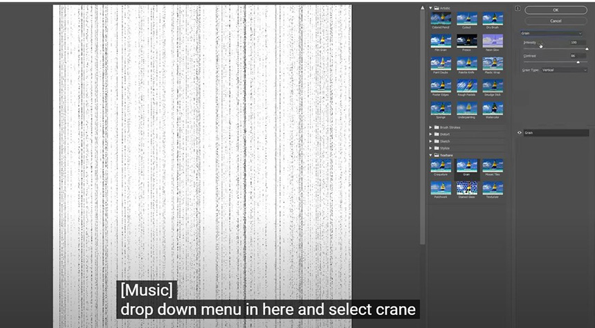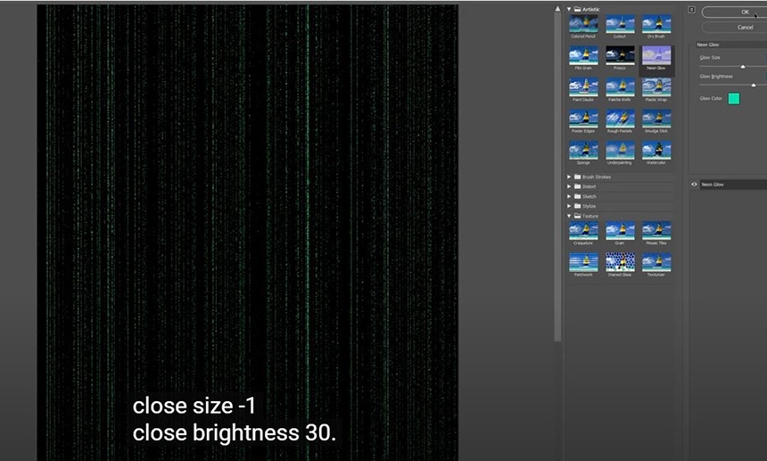 Create In this document, we will create matrix effect, duplicate background layer with CTRL or CMD + J. Go to Filter > Filter Gallery > Texture folder > Grain > drop down menu in here and select “Grain” Intensity 100 Contrast 86 Grain type: Vertical. Confirm