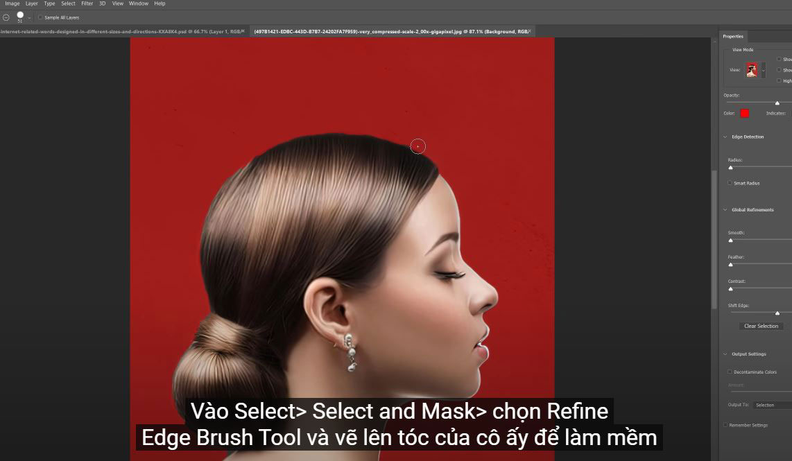 (2). Go to Select > Select and Mask > select the Refine Edge Brush Tool and paint over her hair to soften the selection, then OK