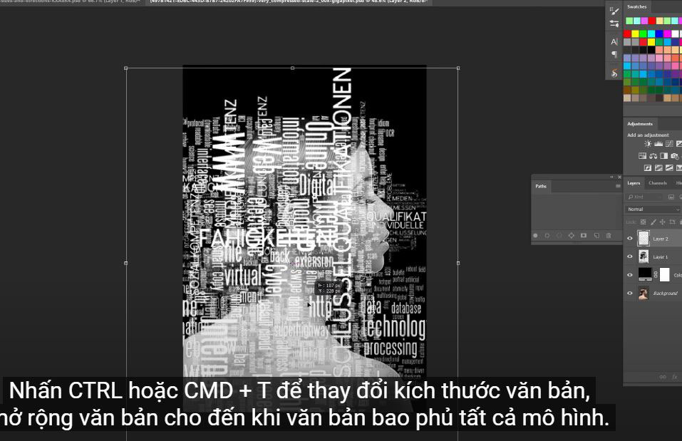 (6). Get the text image to apply to the theme. Press CTRL or CMD + T to resize the text, expanding the text until the text covers all the model.