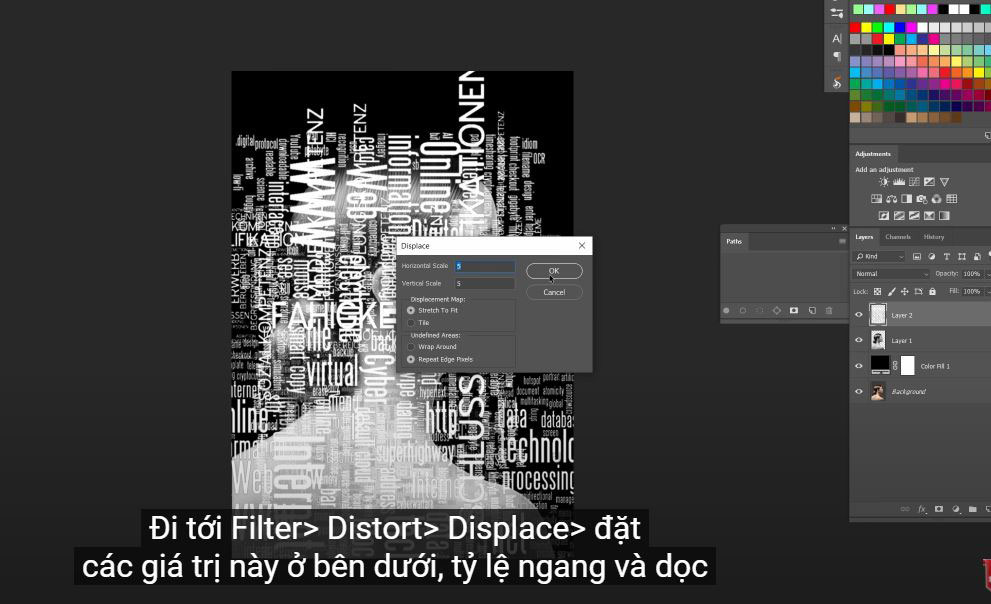 (7). Go to Filter > Distort > Displace > set these values below, horizontal and vertical scale: 5, Displacement map: stretch to fit and undefined areas: repeat edge pixels. Then confirm. Load the PSD file you just saved.