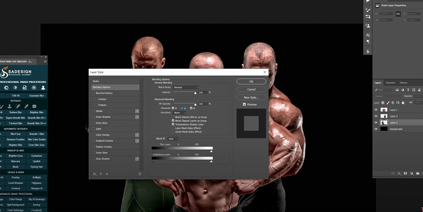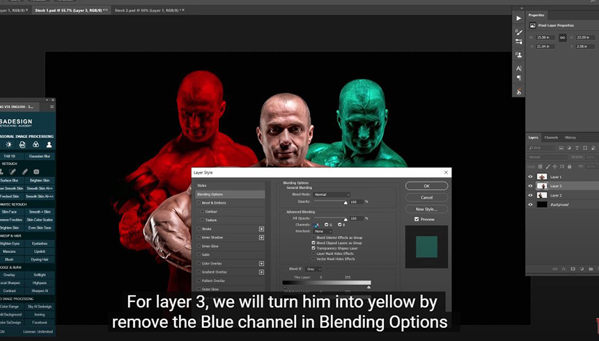 Now, we will handle the left one which is layer 2, go to Blending Options, turn off Green and Blue channels in “Advance blending”, the subject turns to Red.