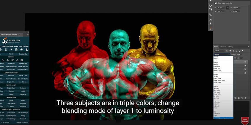 Three subjects are in triple colors, change blending mode of layer 1 to luminosity