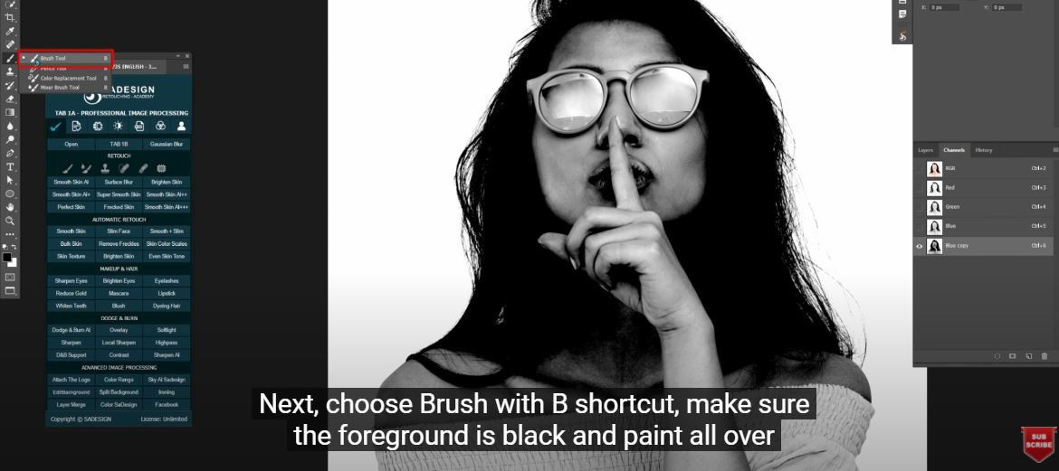(2). Next, choose Brush with B shortcut, make sure the foreground is black and paint all over the subject to make it completely black.