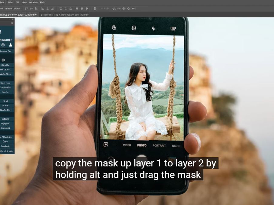 Bring the opacity back to 100% when you are done. Next, copy the mask of layer 1 to layer 2 by holding ALT and just drag the mask to the destination.