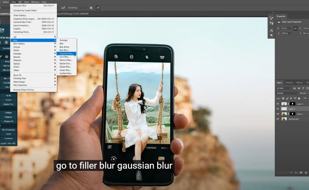 Create a layer mask, use brush tool and paint on her legs to smooth the edges. Go to Filter > Blur > Gaussian Blur > 100 pixels, then confirm Next, we will match color of girl photo and the background. Print layer 2, go to Image > Adjustment > Match Color > In source: select the girl photo.