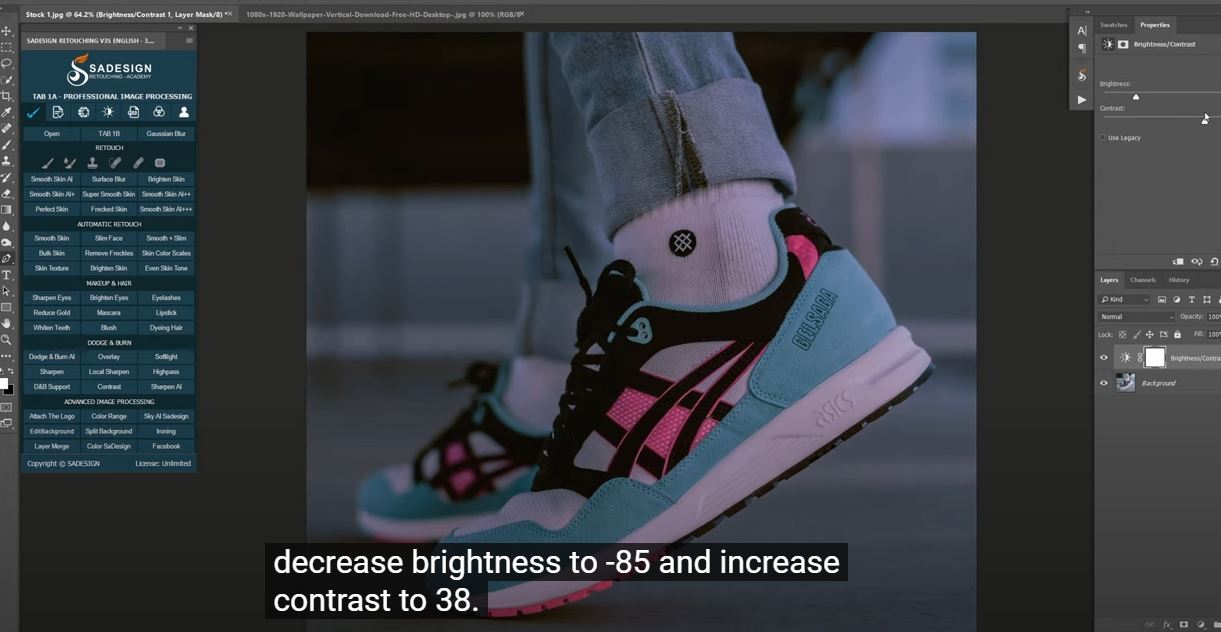 Let’s take this image as an example, I’m going to glow these sneakers. First, I’ll darken the image, click to adjustment icon and choose “Brightness/Contrast”. Decrease brightness to -85 and increase contrast to 38