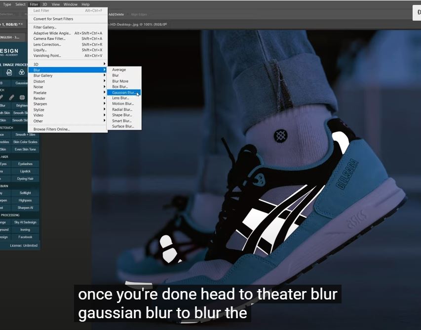 Create color lookup adjustment layer, Choose Filmstock in 3DLUT file and adjust opacity to 50% Then, create new layer, use Brush tool with black color in foreground. Opacity 100% Paint along the border of the canvas, use Gaussian Blur to blur it with around 300 pixels This helps to make the sneakers really stand-out in the image. Brighten the shoes with eraser tool, opacity 50% and paint on it. Finally, use curves to add a bit of contrast to the image.