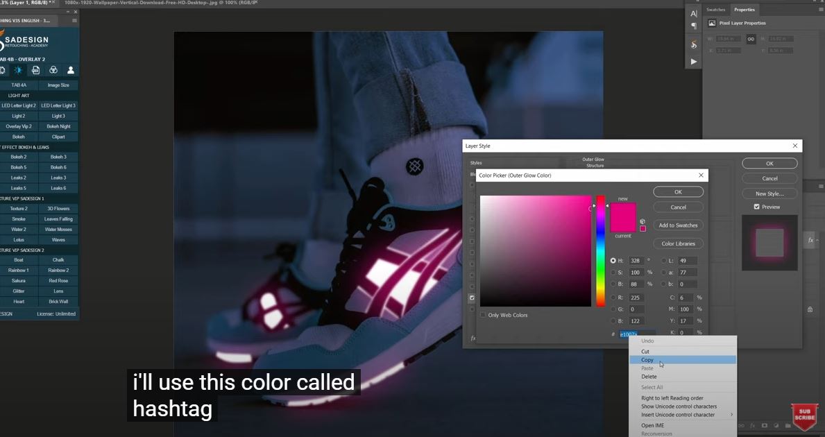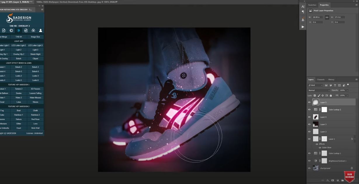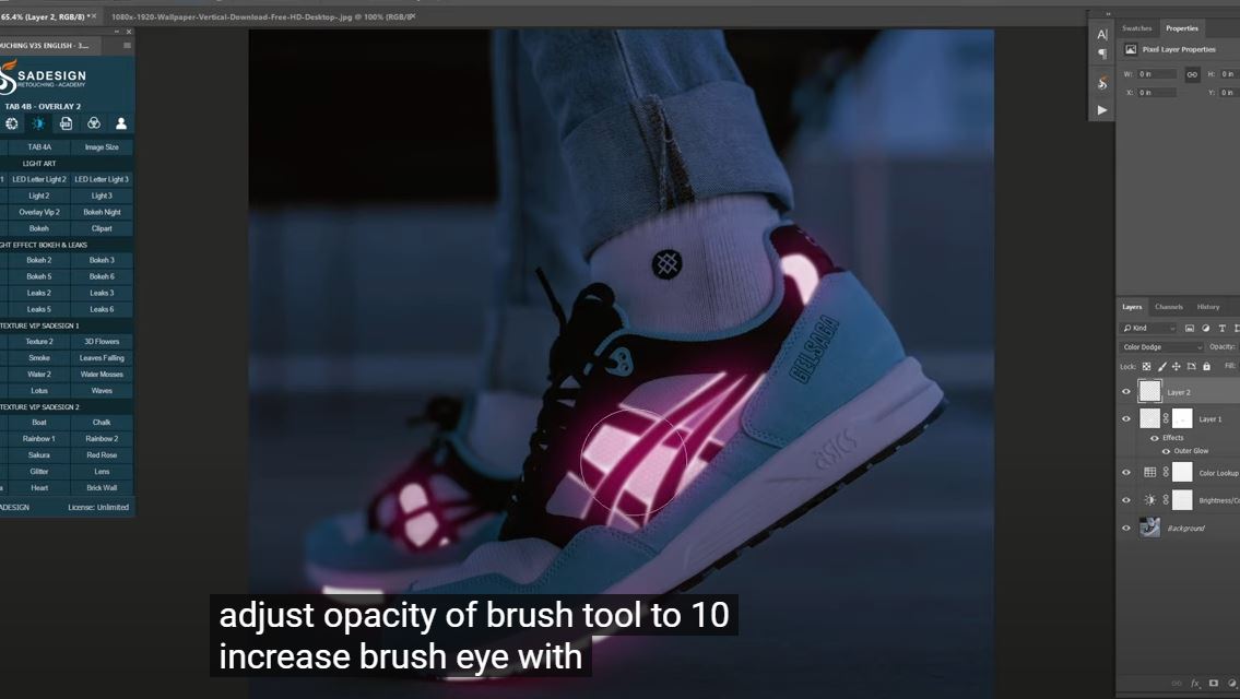 Create layer mask, use brush tool, low opacity, black in foreground color. Paint slightly to the places you want to bring the texture back. Create another layer, change blend mode from normal to color dodge. In foreground color, paste the color code that we choose. Adjust opacity of brush tool to 10%, increase brush size with bracket ] and dab or paint to add a bit of pink color to these areas. In case you accidentally paint too much color, use eraser tool to remove it I’ll decorate with bokeh light. We have tons of stocks in SaDesign retouching panel, feel free to download and give it a try in the link on the description.
