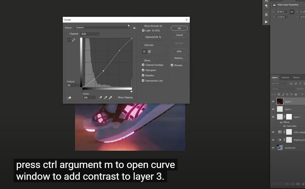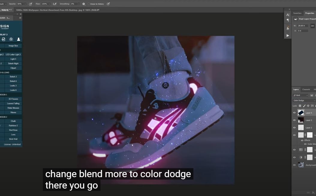 Take this bokeh to our project, zoom out, CTRL+T to adjust the position and flip it vertically Change blend mode to screen. Press CTRL or CMD + M to open Curves window to add contrast to layer 3. Open Hue/Saturation with shortcut CTRL + U, adjust Hue to -12. Pick up eraser tool to remove unnecessary bokeh in the image. Next, use this photo of starry night to create a dreamy look. CTRL+T to rotate it to align with the sneakers Change blend mode to color dodge. There you go! Open Hue/Saturation again with CTRL + U, check to “Colorize” to match color of starry to the glow shoes. Increase saturation to 37.
