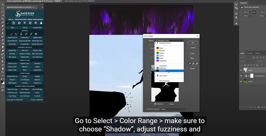 Since it is in black, we will use color range to take the selection. Go to Select > Color Range > make sure to choose “Shadow”, adjust fuzziness and range to the point that you can see the subject is all white except the background. OK