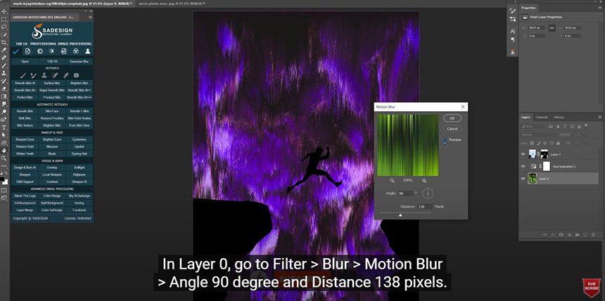 Let’s add motion blur to background. In Layer 0, go to Filter > Blur > Motion Blur > Angle 90 degree and Distance 138 pixels. OK