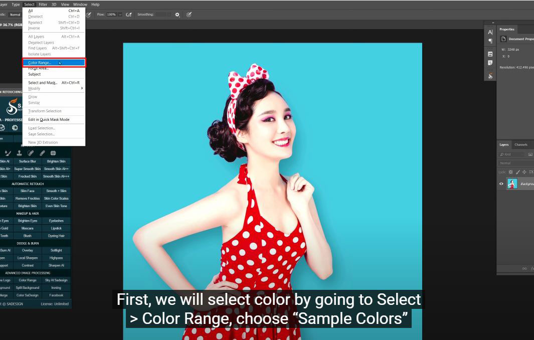 (2).Furthermore, I’ll show you how to change the color on her dress right now. Again, to go Select > Color Range > pick eyedropper tool and click to her dress and increase the fuzziness until her headband is also selected.