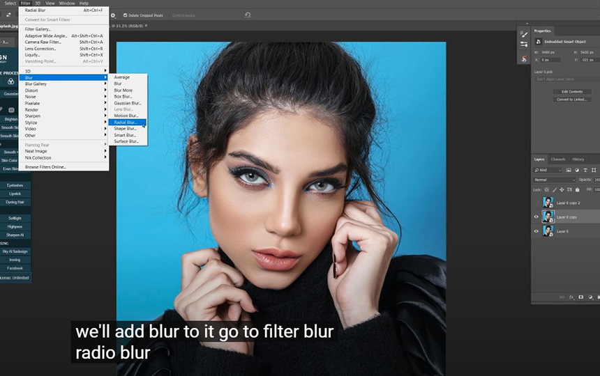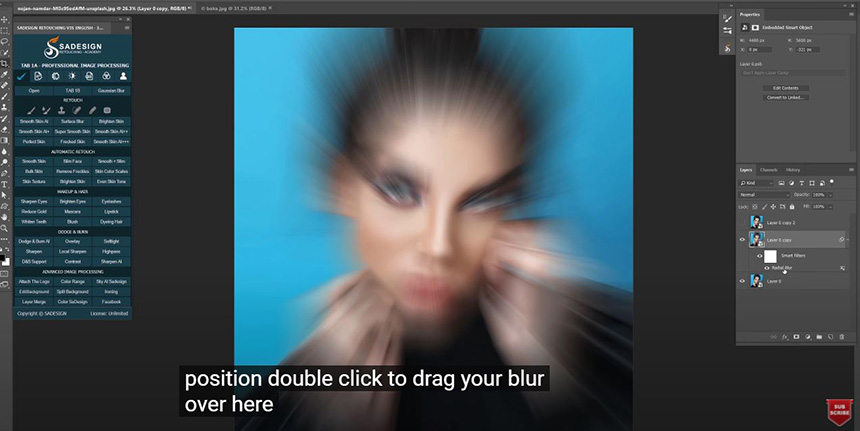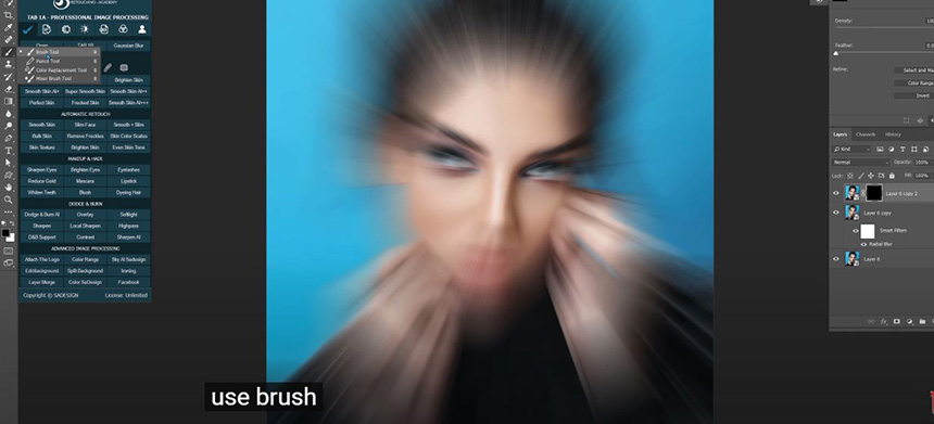 If you want to adjust the blur position, double click to Radial blur over here, and move the dot right in the center of the model's face. Don't worry about her eyes, we will fix that now.
