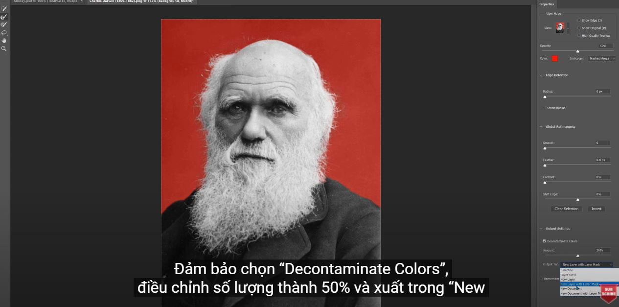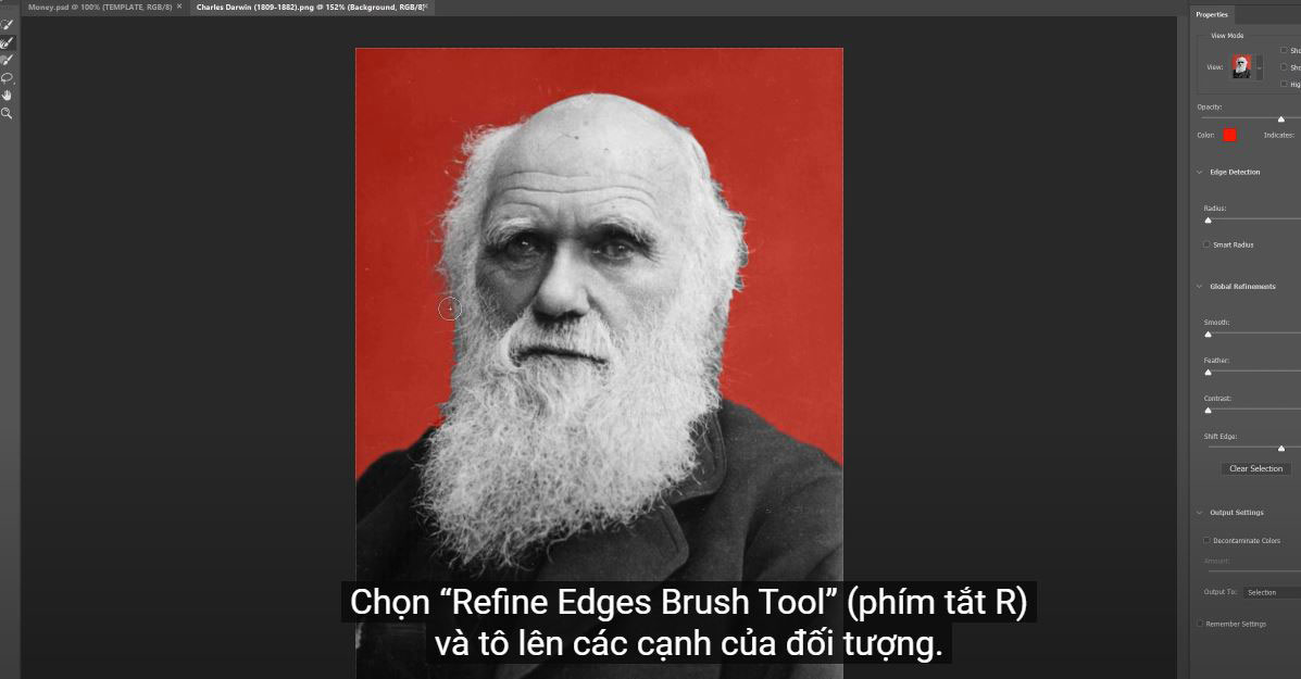 Then Select > Select and Mask for a more precise selection. Select the “Refine Edges Brush Tool” (shortcut R) and paint over the edges of the object. While drawing, you can see that this tool will remove the background but keep his hair intact.