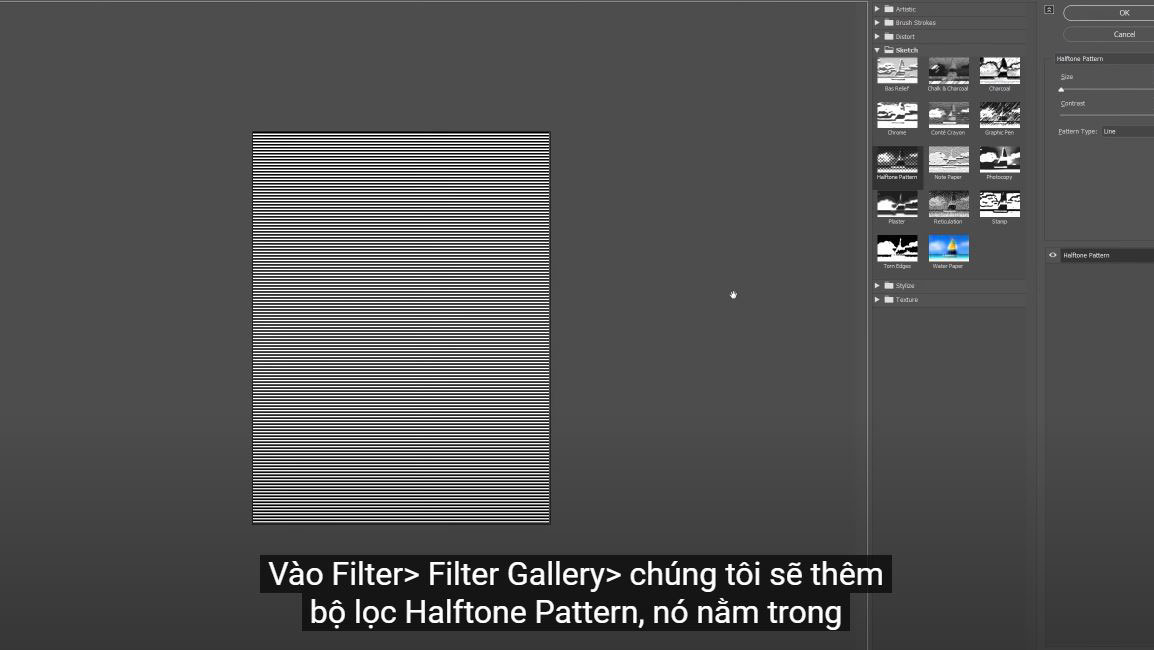 Go to Filter > Filter Gallery > we'll add the Halftone Pattern filter, it's in the sketch folder.