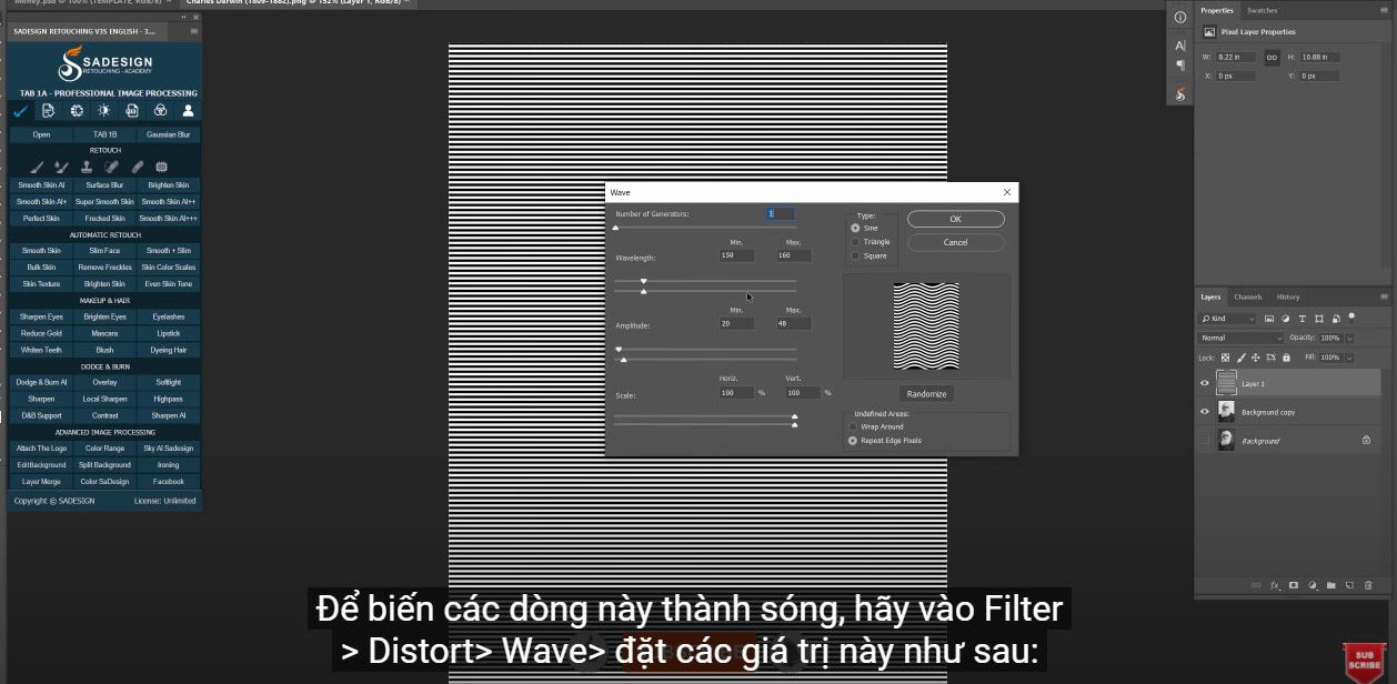 To turn these lines into waves, go to Filter > Distort > Wave > set these values like below: