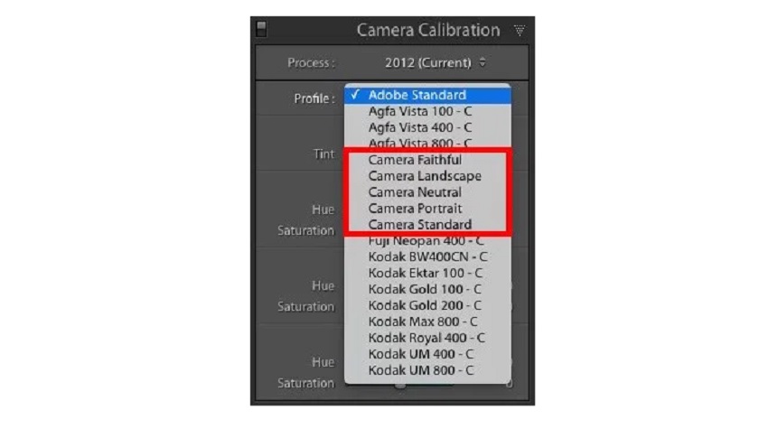 If you go to the Camera Calibration panel in Lightroom and look at the Profile menu, you'll find a list of your camera's available palettes. The options you have seen properties of the camera used to take the picture. White black configured is only available for newer cameras. This is the option shown in Lightroom for taking pictures with Canon EOS cameras. The profiles in the red square simulate the Camera Style photo collaboratively. The other profiles are Adobe Standard (available for all cameras) and these come with a set of VSCO presets that I purchased.