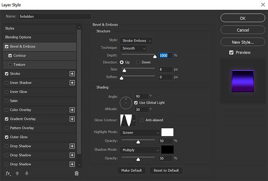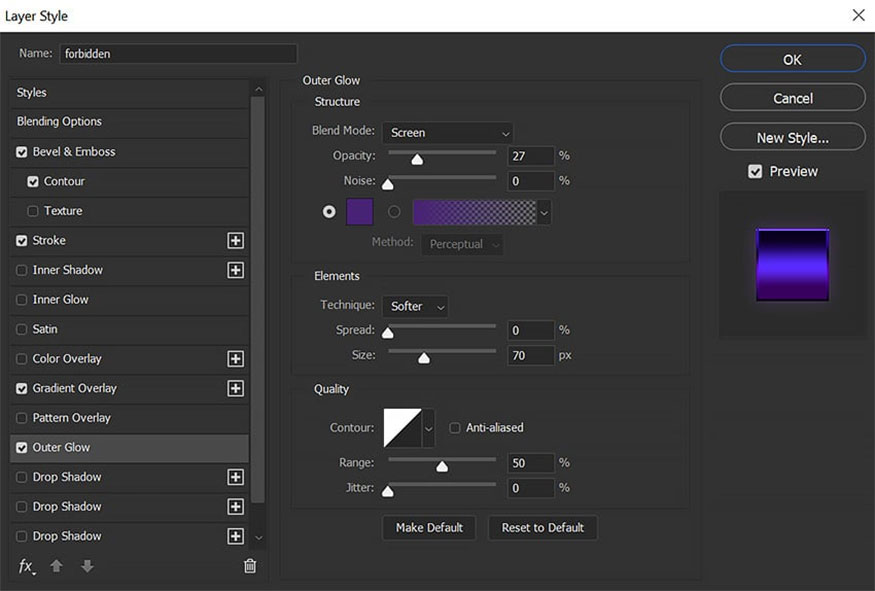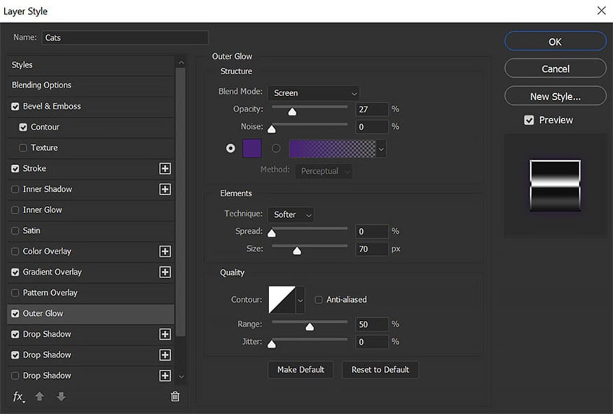 Add a purple Outer Glow layer style color coded #492276 to all objects. Then group all the objects together, each Color Balance layer set to Green -100 and Blue +100. This is to give all images a purple tone.