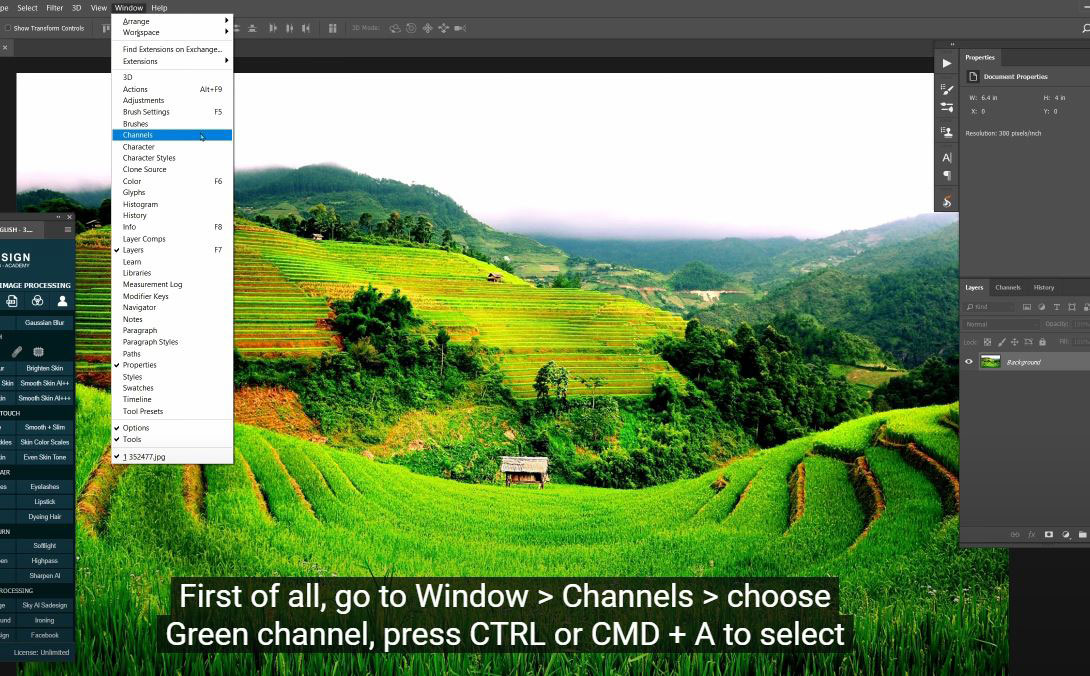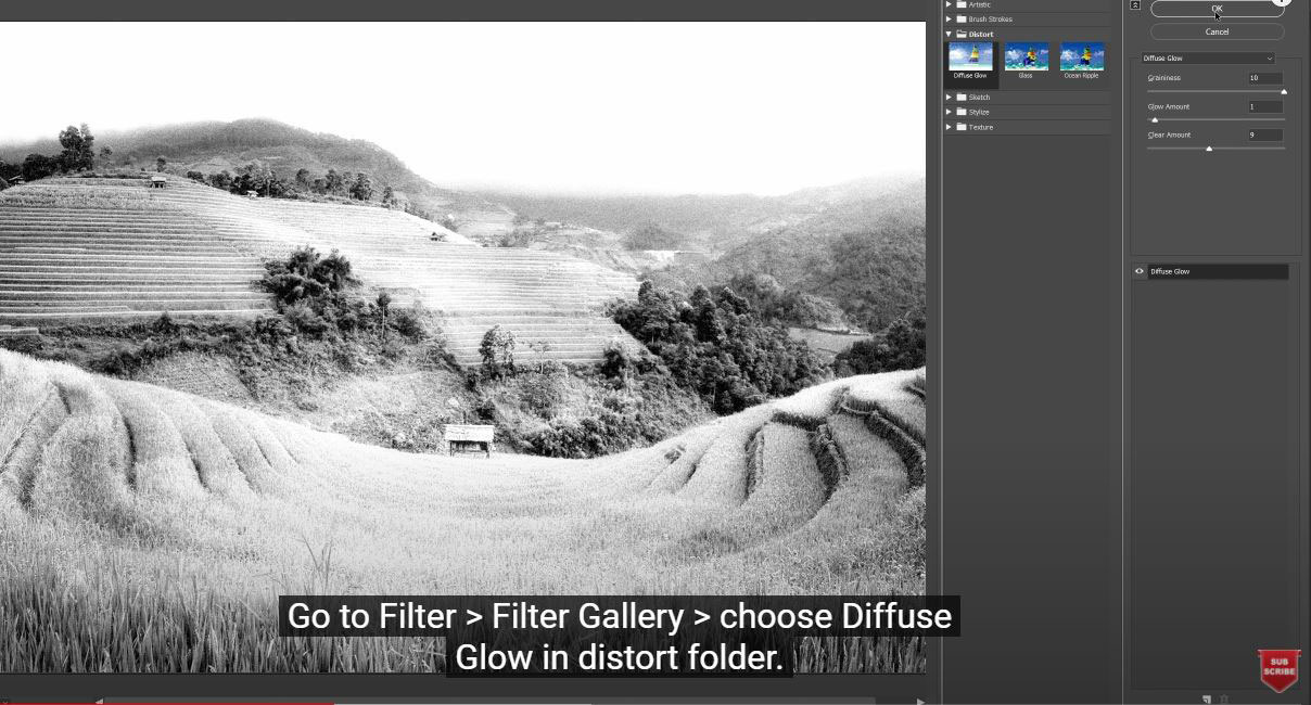 (1). First of all, go to Window > Channels > choose Green channel, press CTRL or CMD + A to select the whole image and copy it with CTRL + C. Move back to layers tab, create a new layer and paste it. Go to Filter > Filter Gallery > choose Diffuse Glow in distort folder. Create a solid color with black, go to Filter > Noise > Add noise > Rasterize > amount 100% and OK. Now, we will blur it with gaussian blur around 1 pixel, change blending mode to screen. Use “Levels” shortcut CTRL or CMD + L to increase black to 140 and decrease white to 142.