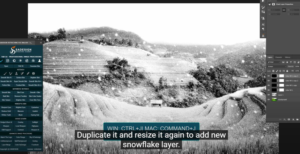 (3). Filter > Blur > Motion Blur > angle –48 and distance is 11 pixels. Duplicate it and resize it again to add new snowflake layer. Put all layers into group. That’s all for this tutorial. If you think this video is helpful, hit like, subscribe and ring the bell for any guide videos later on. See ya!