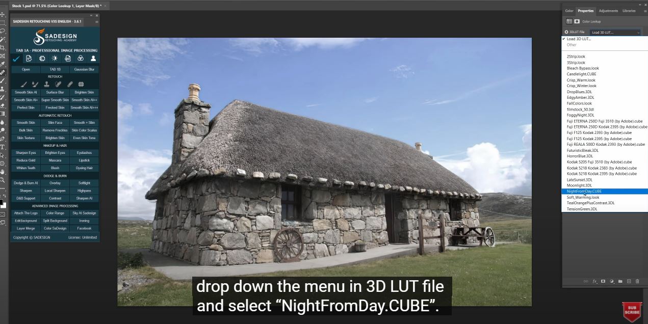 Create a color lookup adjustment layer, drop down the menu in 3D LUT file and select “NightFromDay.CUBE”. There you go, it’s cool right?