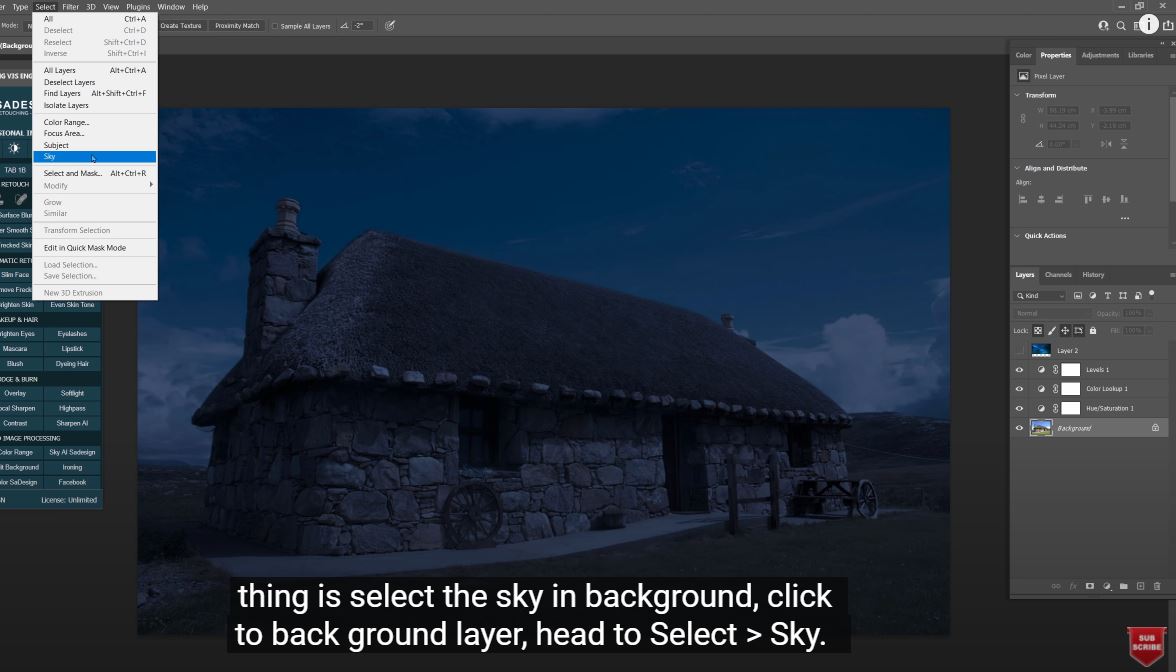 It’s time to do sky replacement. First thing is select the sky in background, click to back ground layer, head to Select > Sky. PTS AI will automatically select the sky for you and it did a great job!
