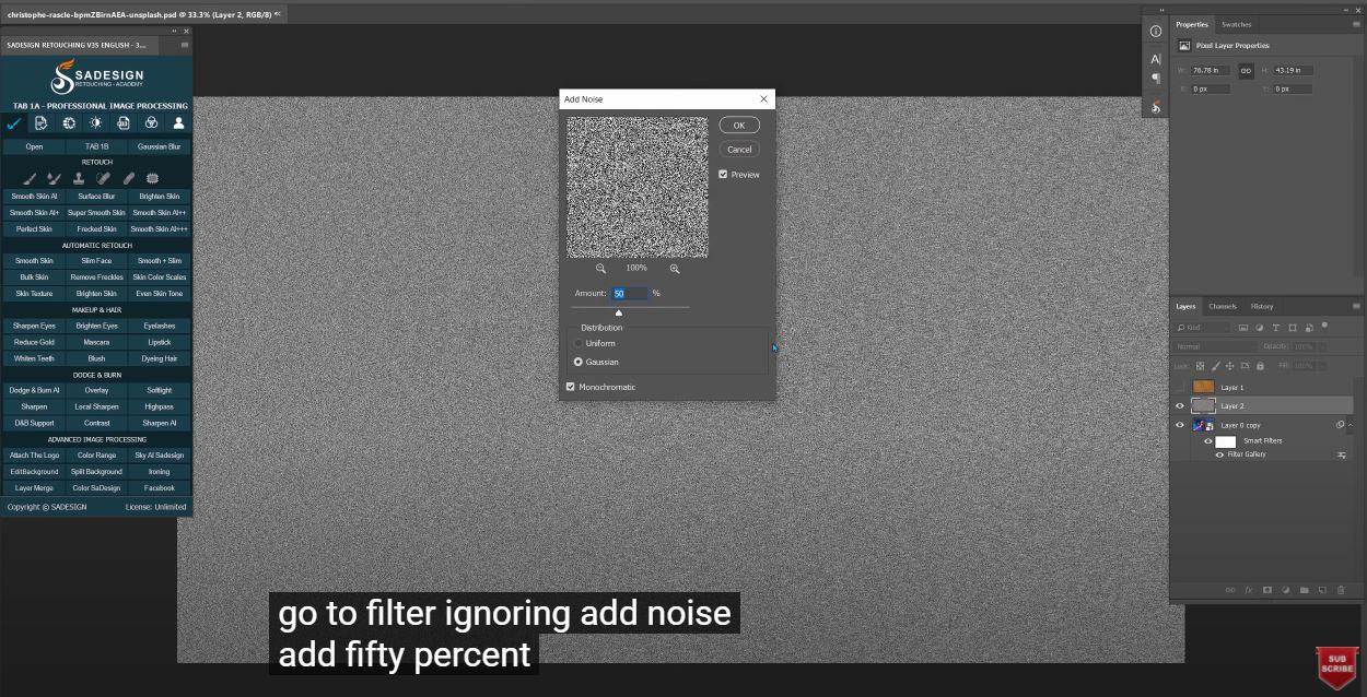 Go to Filter > noise > add noise > add 50% of noise to this layer, ensure to choose “Gaussian” in distribution. Chang to overlay in blend mode.