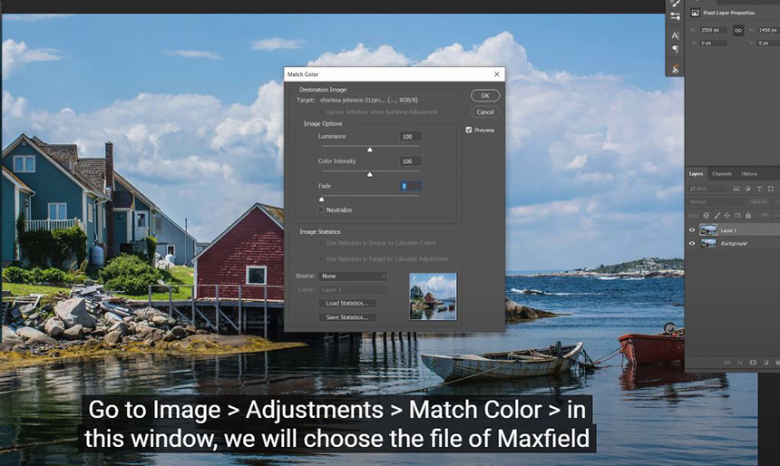 o to Image > Adjustments > Match Color > in this window, we will choose the file of Maxfield Parrish in source for color matching. Set Luminance and color intensity to maximum. Then OK